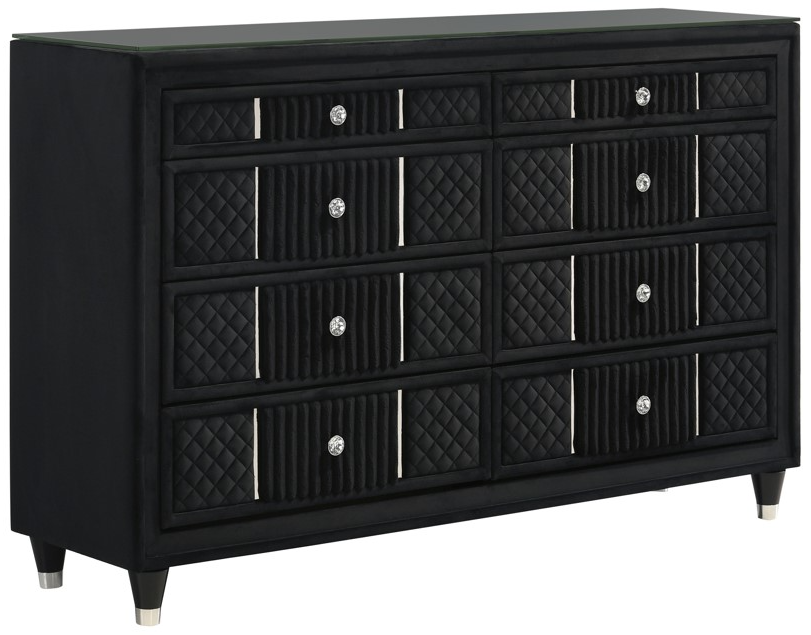 Coordinating case pieces echo the luxurious feel, with velvet drawer fronts, faceted crystal-style knobs, and a sleek black finish that exudes elegance. Ideal for those seeking a statement-making aesthetic, this group combines plush comfort with a contemporary edge, perfect for elevating upscale bedroom interiors.