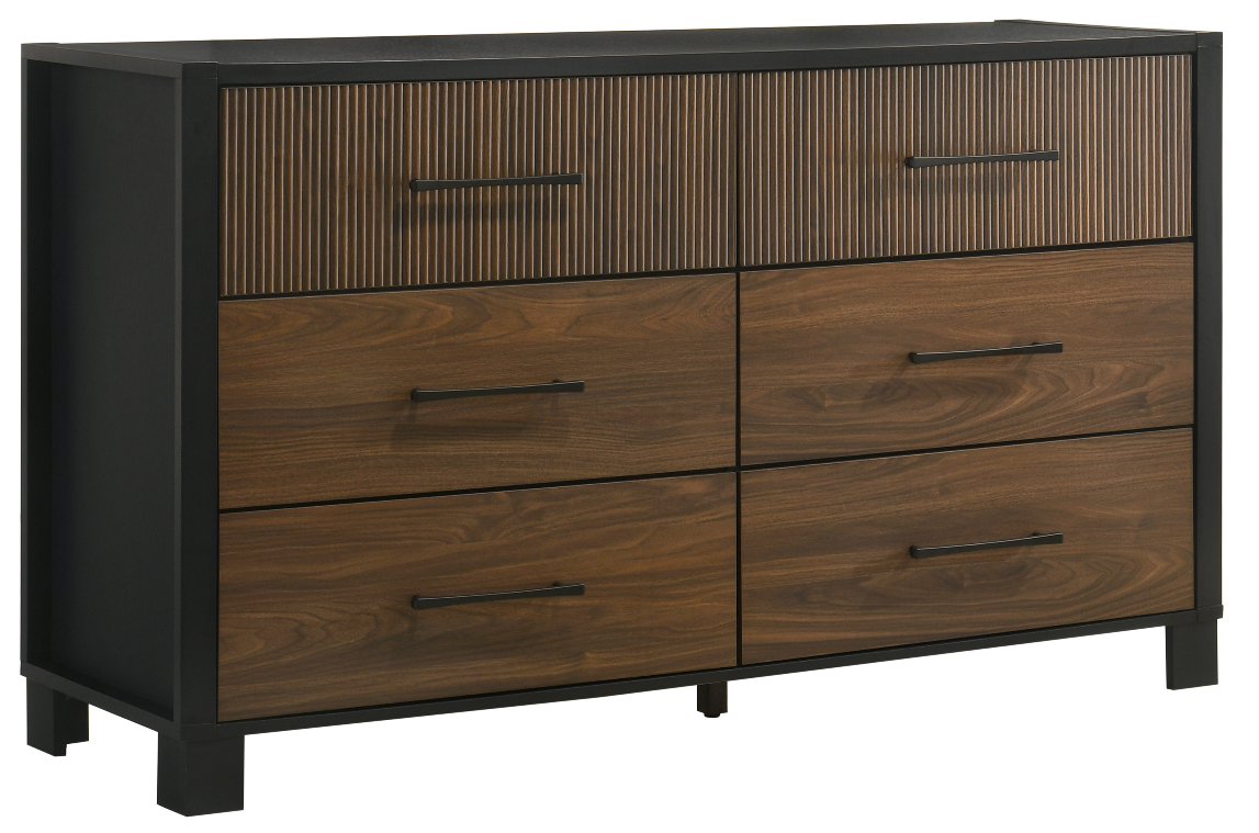 The rich wood finishes, paired with bold, black accents, offer a perfect balance of elegance and contemporary style. Each piece is meticulously crafted, featuring spacious drawers and streamlined hardware for a clutter-free, organized space. Elevate your bedroom with this stunning ensemble that fuses functionality with high-end design, ensuring a serene and stylish retreat.