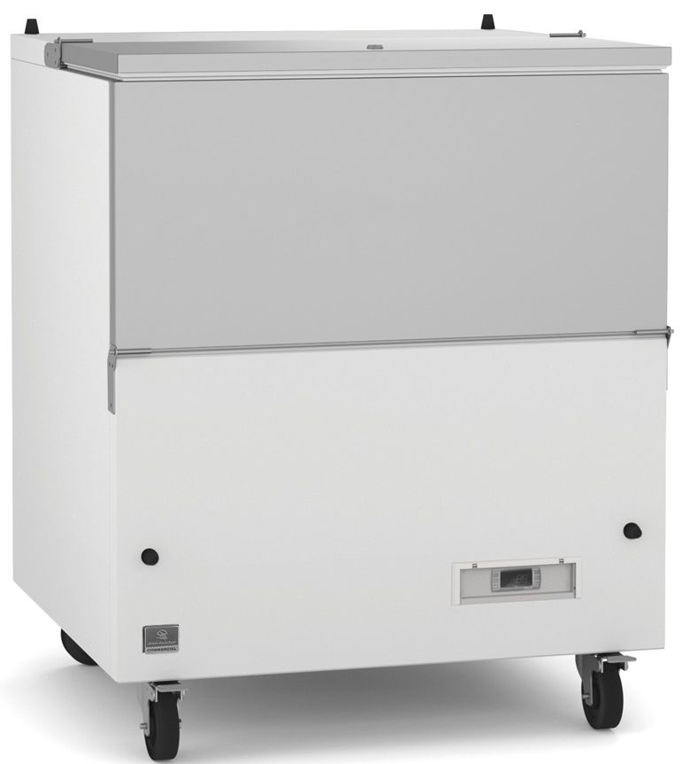 School milk cooler with exterior back panel in white-painted steel, bottom panel in galvanized steel, exterior side panels in white-painted steel and top in 430 stainless steel; interior back and side panels in 430 stainless steel, interior bottom in 304 stainless steel.Read More