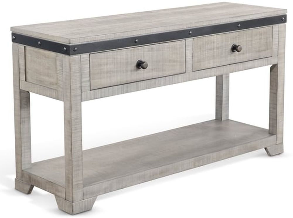 The Alpine Grey occasional collection features distressed mahogany with slated panel sides. The added metal details add an industrial touch. This sofa table will definitely add style to your room.Read More